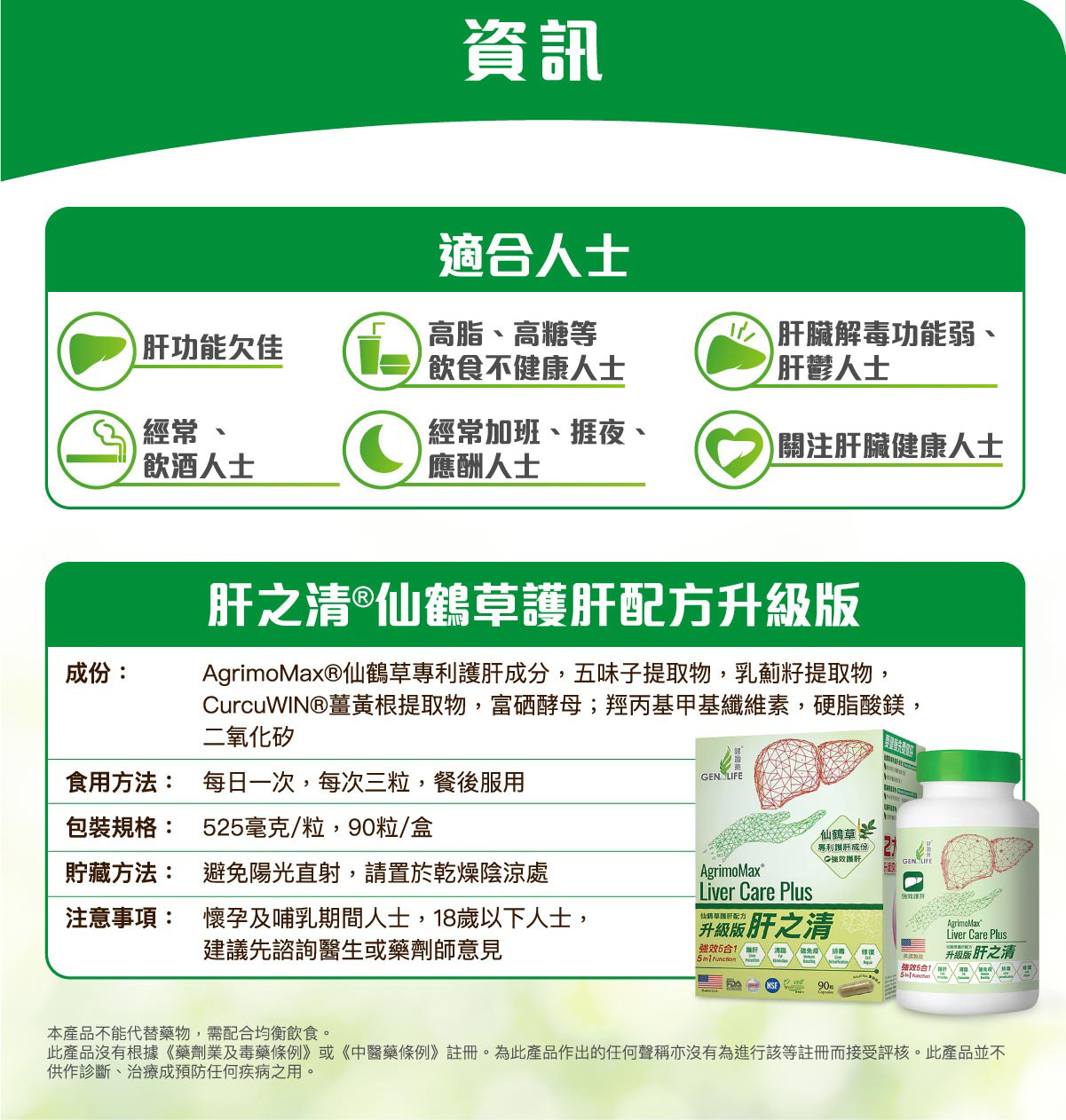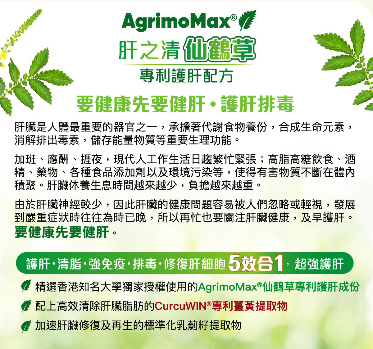 肝之清®仙鶴草護肝配方精選香港知名大學獨家授權的AgrimoMax®專利護肝成份,科學研究證實能顯著預防肝臟細胞變異,保護肝臟免受異細胞侵害;同時對DNA氧化損傷具有良好的保護作用,增強肝臟細胞抵抗力。
