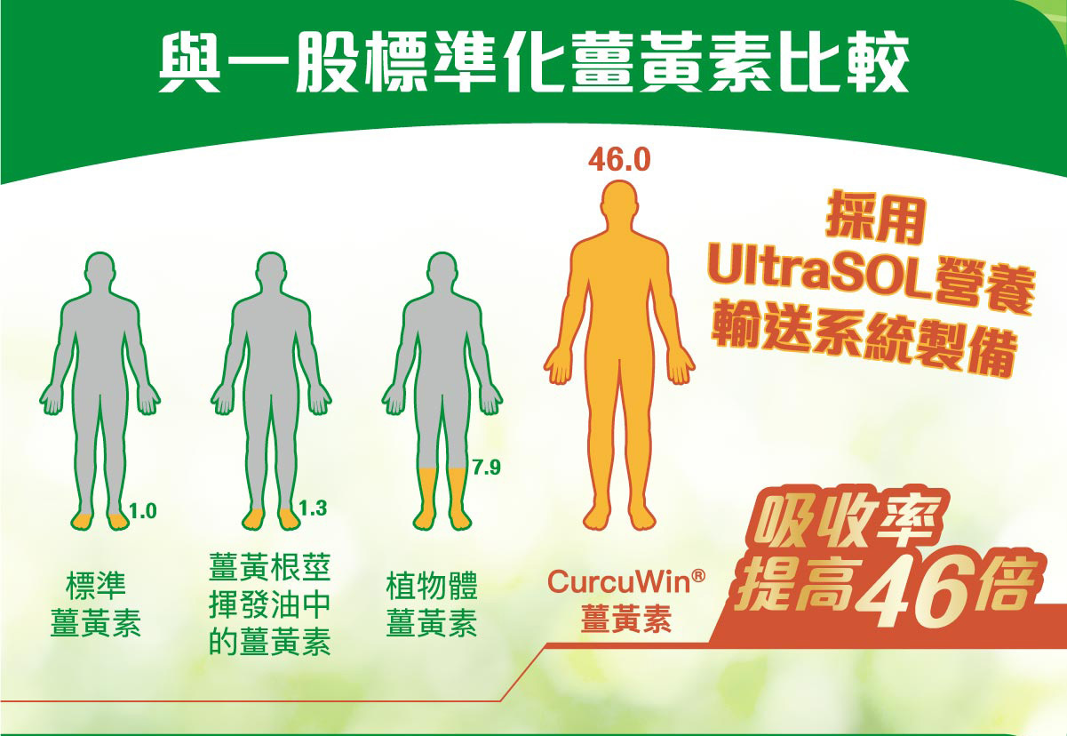 使用UltraSOL™營養輸送系統製備的 CurcuWin®薑黃素,與標準化薑黃素比較,吸收率提高46倍,增加薑黃素在身體的吸收和生物利用度,充分發揮薑黃素的保健功能。有助降低肝臟脂肪含量。