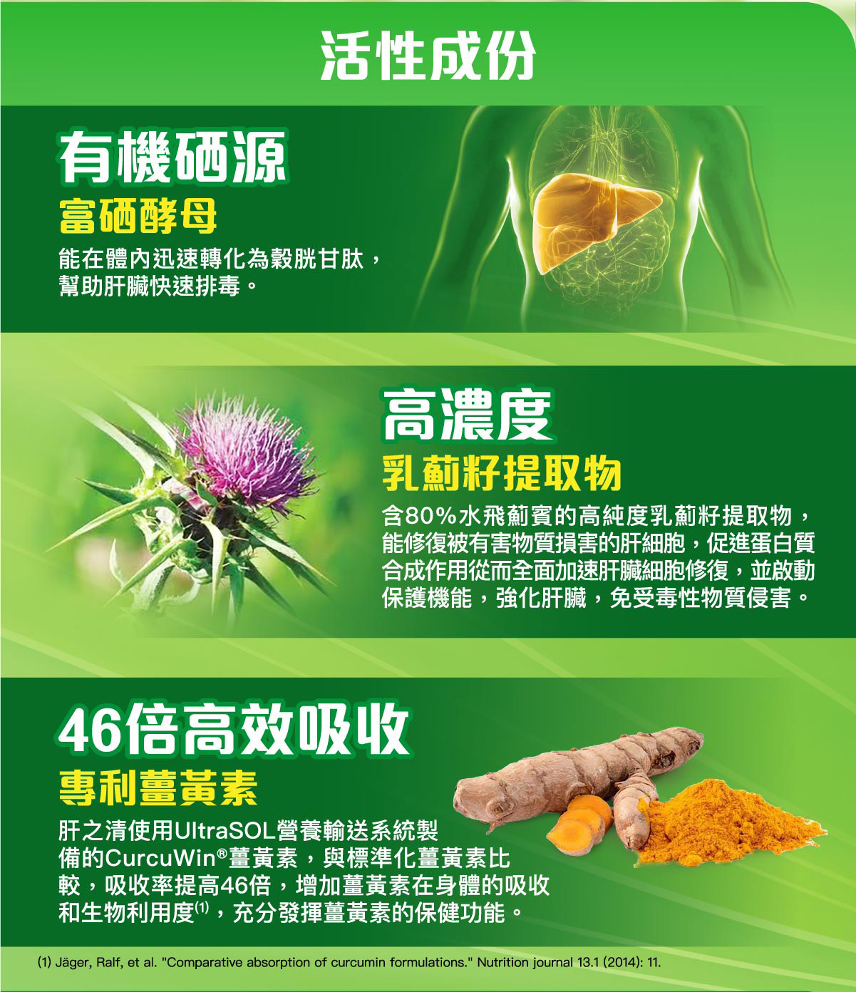 含80%水飛薊賓的高純度乳薊籽提取物,能修復被有害物質損害的肝細胞,促進蛋白質合成作用從而全面加速肝臟細胞修復,並啟動保護機能,強化肝臟,免受毒性物質侵害。